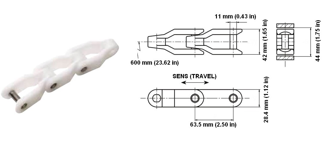 Chaine biplan au pas de 63.5 mm acétal blanc, le m