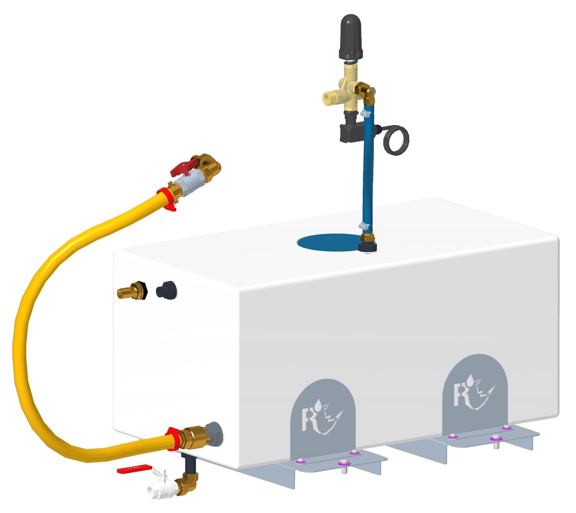 - Cuve de stockage d’eau posée sur deux supports en tôle inox 304L